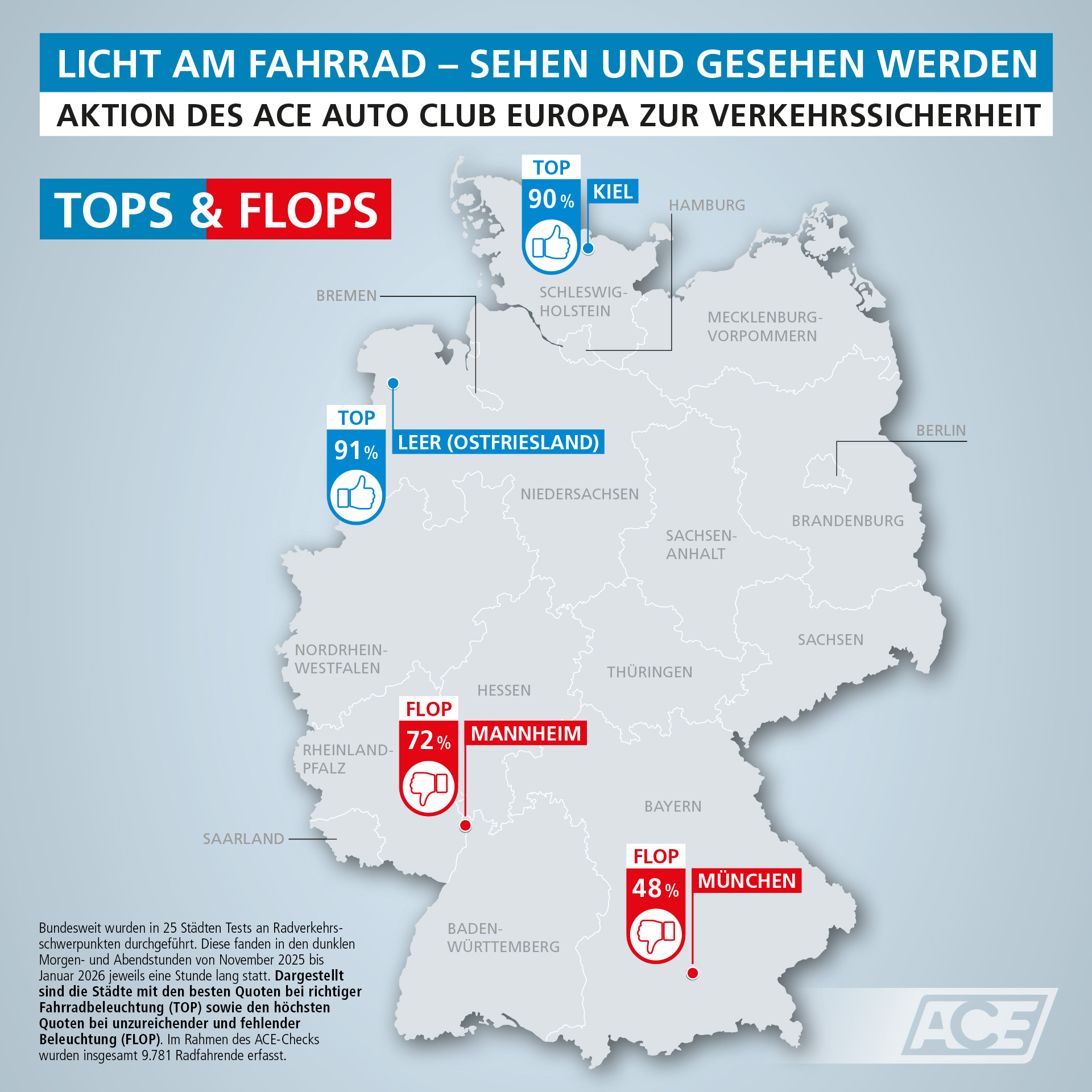 Der ACE hat eine bundesweite Zählaktion von November 2025 bis Ende Januar 2026 durchgeführt. Ehrenamtliche ACE-Testerinnen und -Tester erfassten jeweils eine Stunde lang in den dunklen Morgen- und Abendstunden in 25 Städten und Gemeinden insgesamt 9.781 Radfahrende und suchten vielerorts auch das beratende Gespräch vor Ort. Die Tests wurden an Radverkehrsschwerpunkten durchgeführt und sind Momentaufnahmen in Form von Stichproben. Orte mit weniger als 50 erfassten Radfahrenden innerhalb einer Stunde wurden nicht ausgewertet.