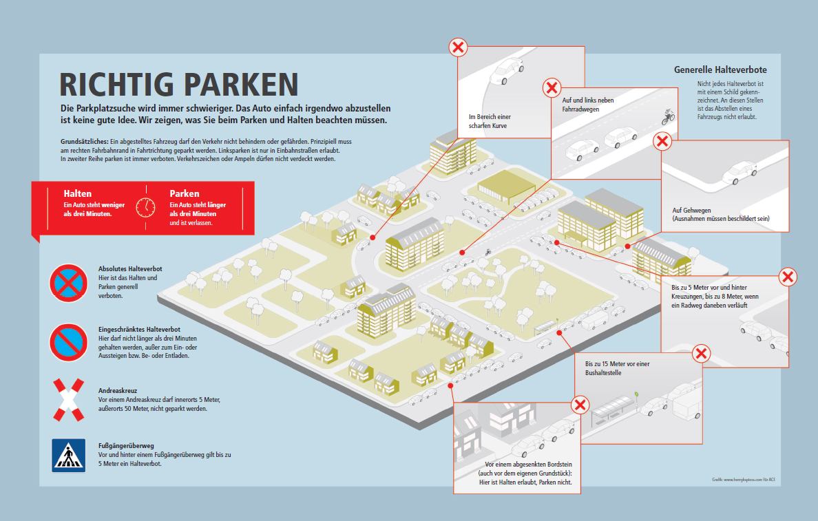 Berlin (ACE) –Parkraum ist insbesondere in Städten knapp. Umso wichtiger ist es, die geltenden Vorgaben für das Abstellen von Fahrzeugen zu beachten. Falsch abgestellte Fahrzeuge gefährden nicht nur den Verkehrsfluss, sondern erhöhen auch das Unfallrisiko für Fußgängerinnen und Fußgänger sowie den Radverkehr. Der ACE Auto Club Europa erläutert, wo das Parken grundsätzlich erlaubt ist und welche Bereiche freizuhalten sind.