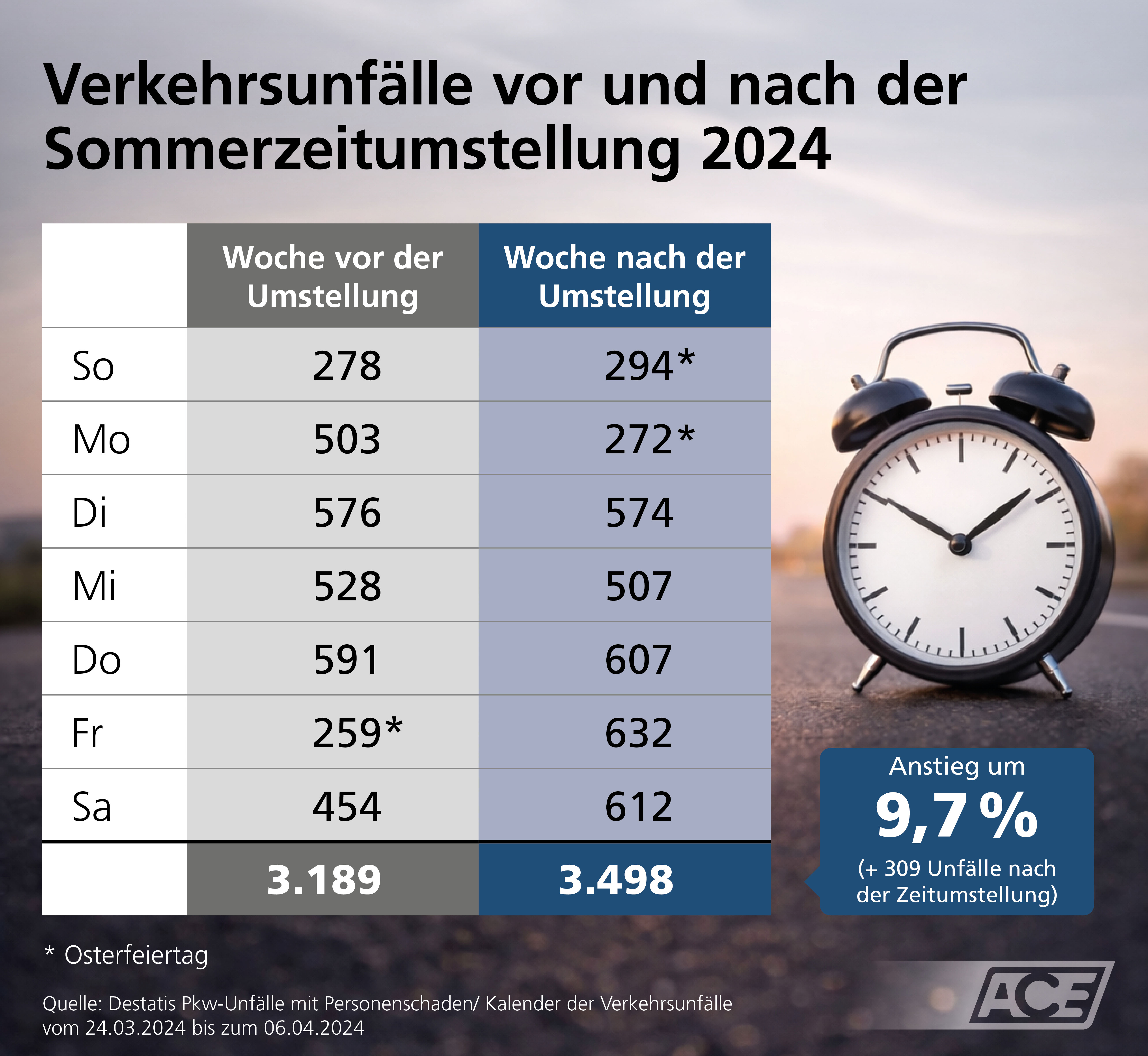 >> ACE-Grafik zu Verkehrsunfällen vor und nach der Sommerzeitumstellung 2024 (redaktionell frei nutzbar)